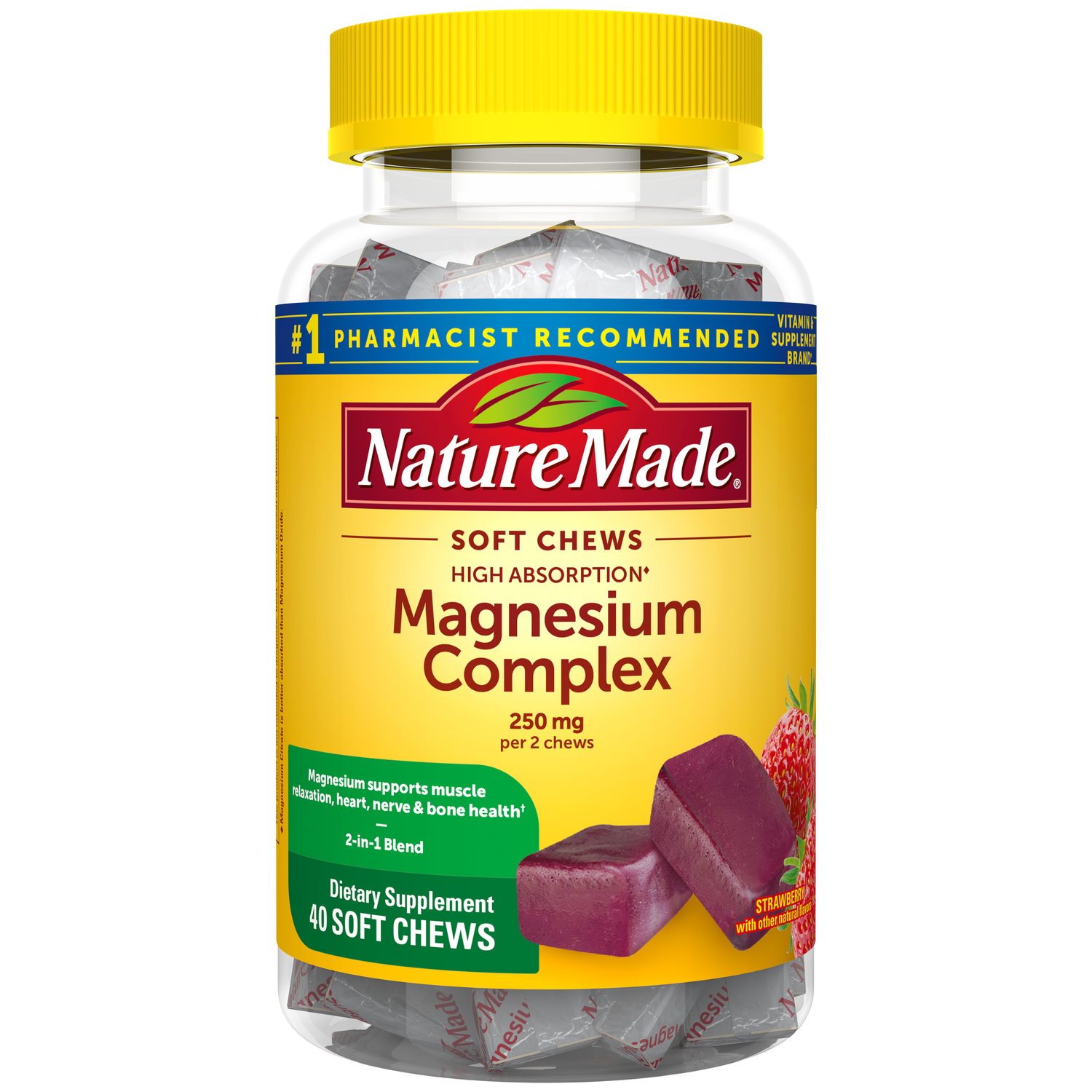 Take your Magnesium on the go with two individually wrapped High Absorption◆ Magnesium Complex Soft Chews delivering a blend of Magnesium Citrate and Magnesium Malate to support muscle relaxation, heart, nerve & bone health.†