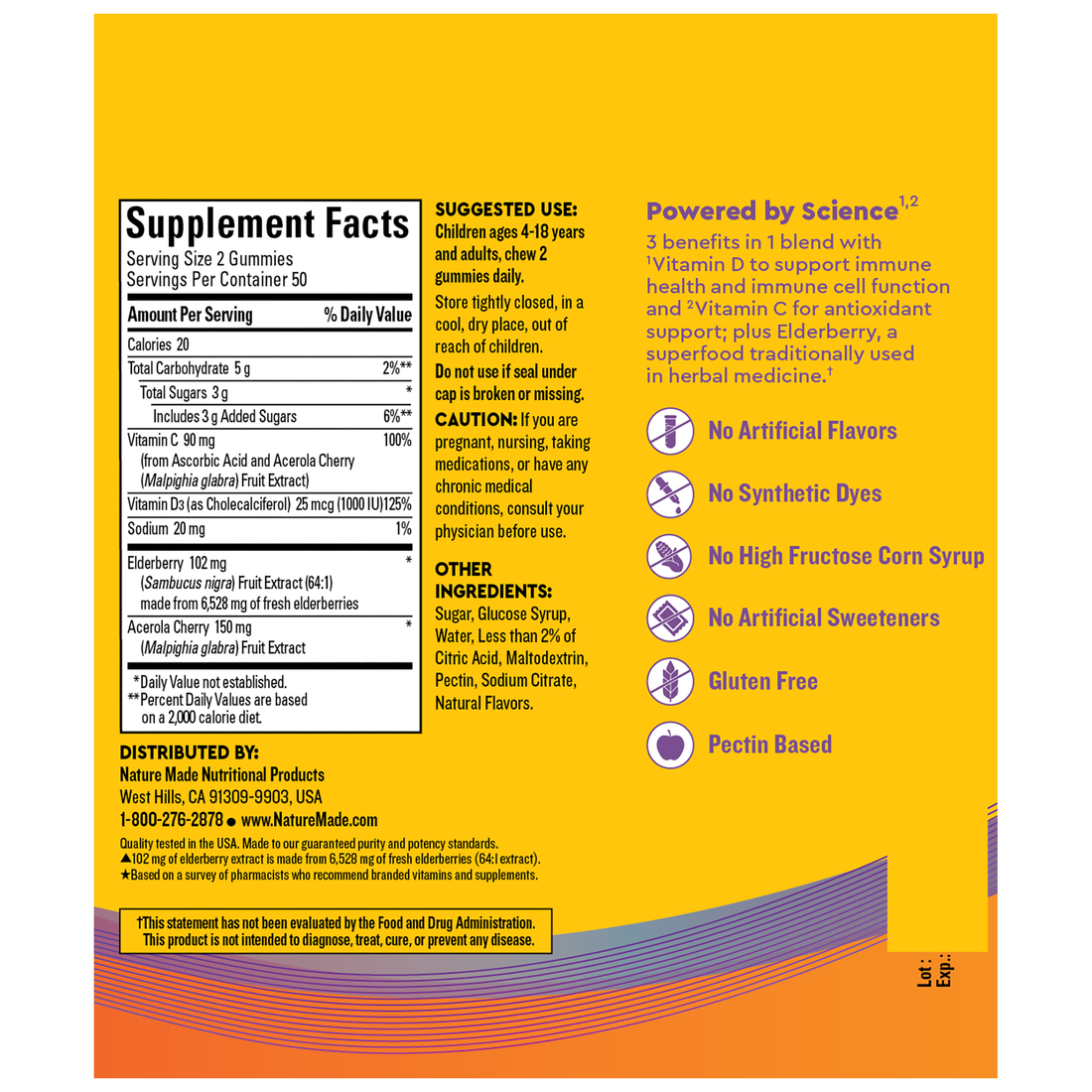 Immune support gummies for kids & adults: 3 benefits in 1 blend with Vitamin D and Vitamin C for immune support plus Elderberry, a superfood traditionally used in herbal medicine.